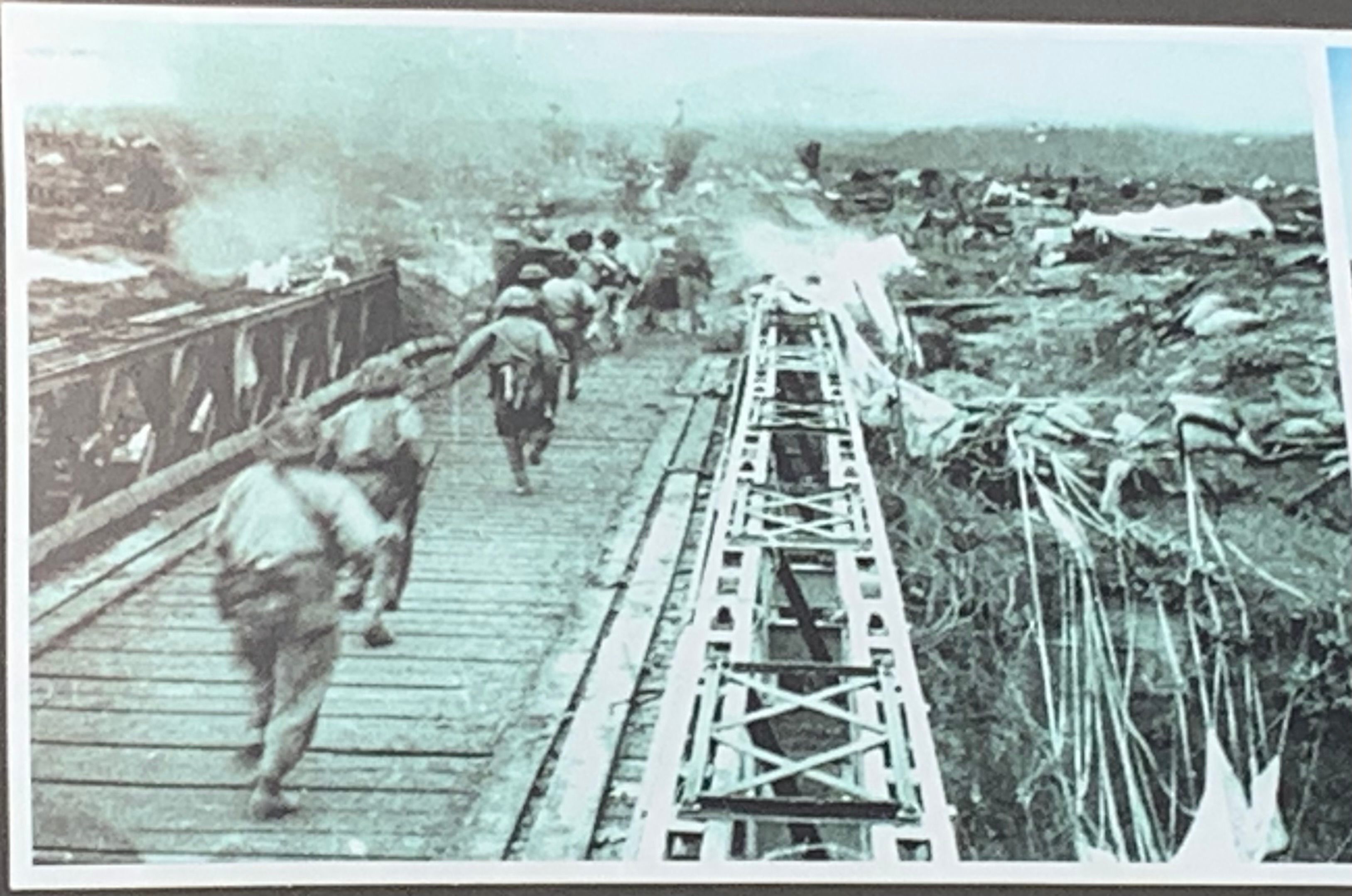 Pause devant le pont Bailey sur la Nam Youn, ultime obstacle naturel avant la chute du PC français.
