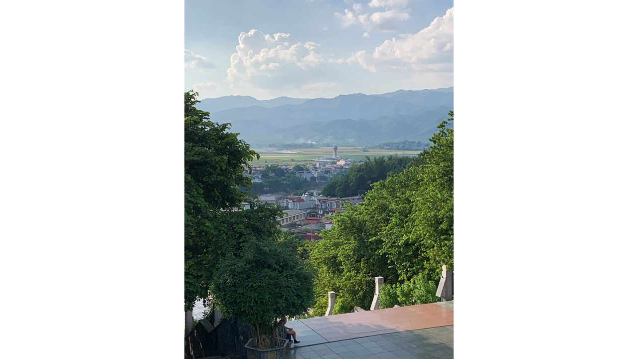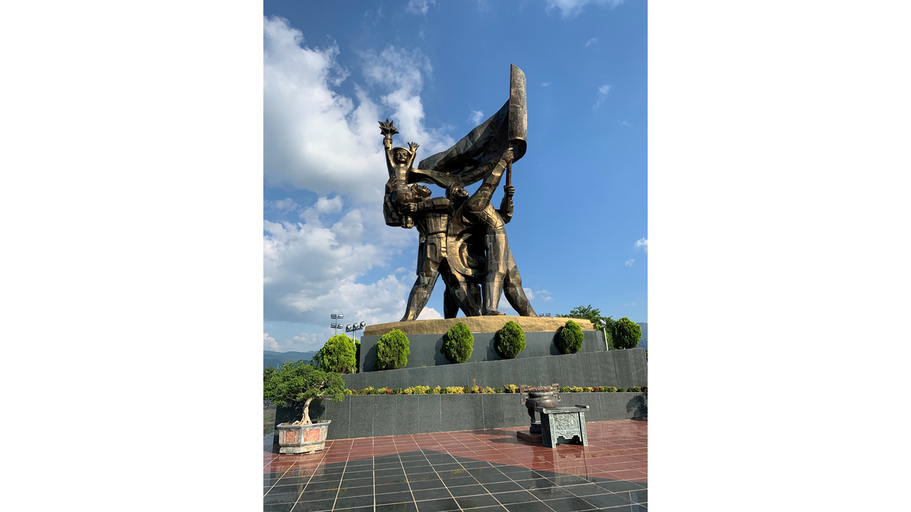 Vue panoramique de la cuvette depuis le Point d'Appui Dominique, dominé par un imposant monument vietminh de style soviéto-chinois.
