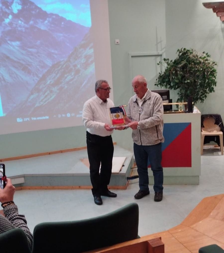 Jean-Pierre SAGET, président de l'amicale de 2005 à 2020 reçu des mains du président actuel, la réplique du drapeau de l'ACOPS. Félicité pour avoir tenu les rênes de l'amicale pendant toutes ces années.